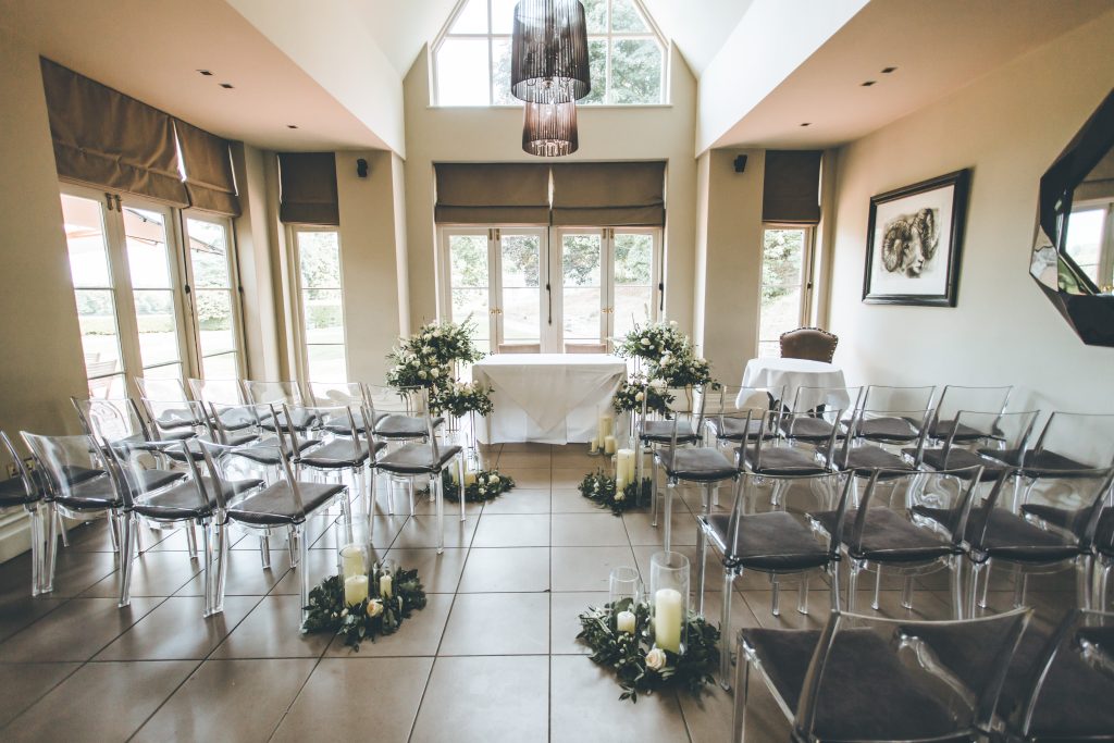 The ceremony room at Talbooth House & Spa oozes modern elegance. As a result, we wanted to keep the ceremony arrangements simple. We opted for arrangements which focused on an abundance of foliage for the aisle, whilst creating a tall installation with gold frames to create a focal point around the ceremony table.