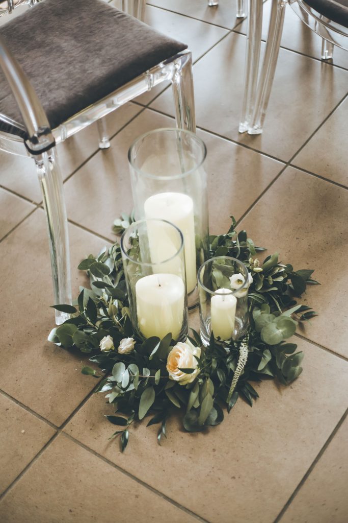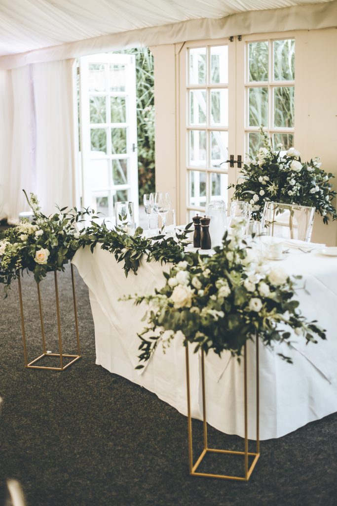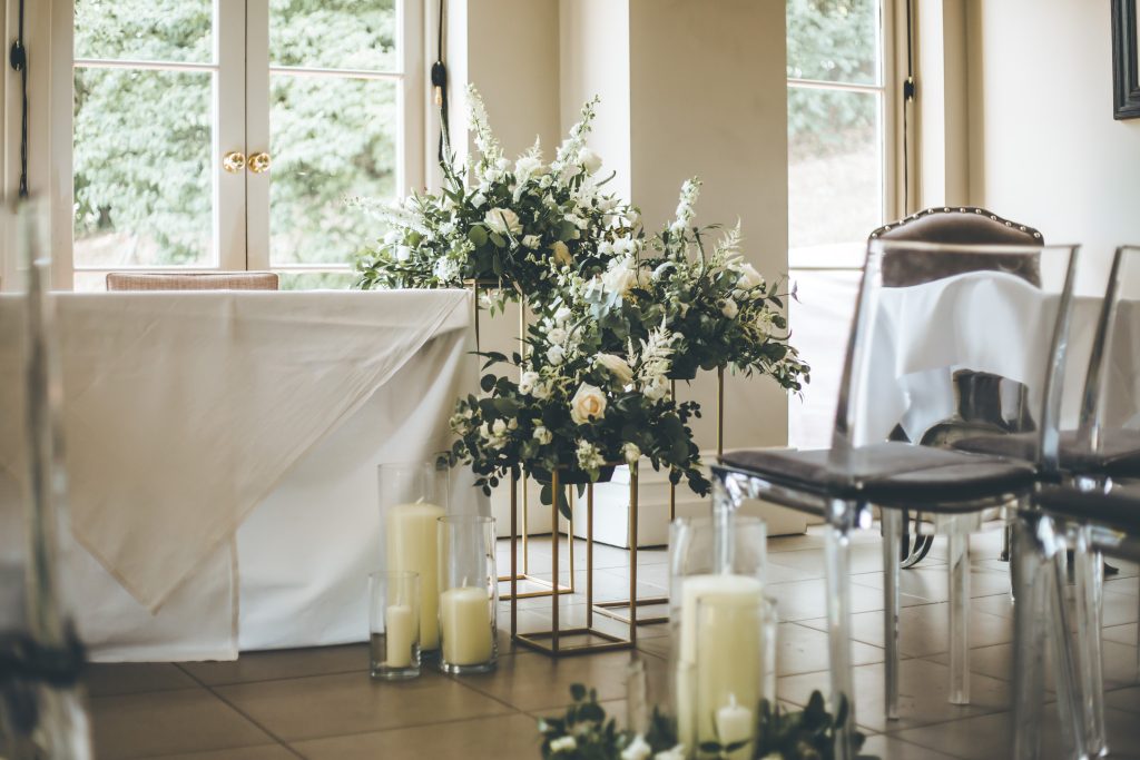 As it was a small, intimate wedding, M & B didn’t require lots of additional flowers for the wedding breakfast. As a result, we got creative and simply repurposed the aisle candles and foliage for the guest tables, whilst using the ceremony flowers to frame the top table.