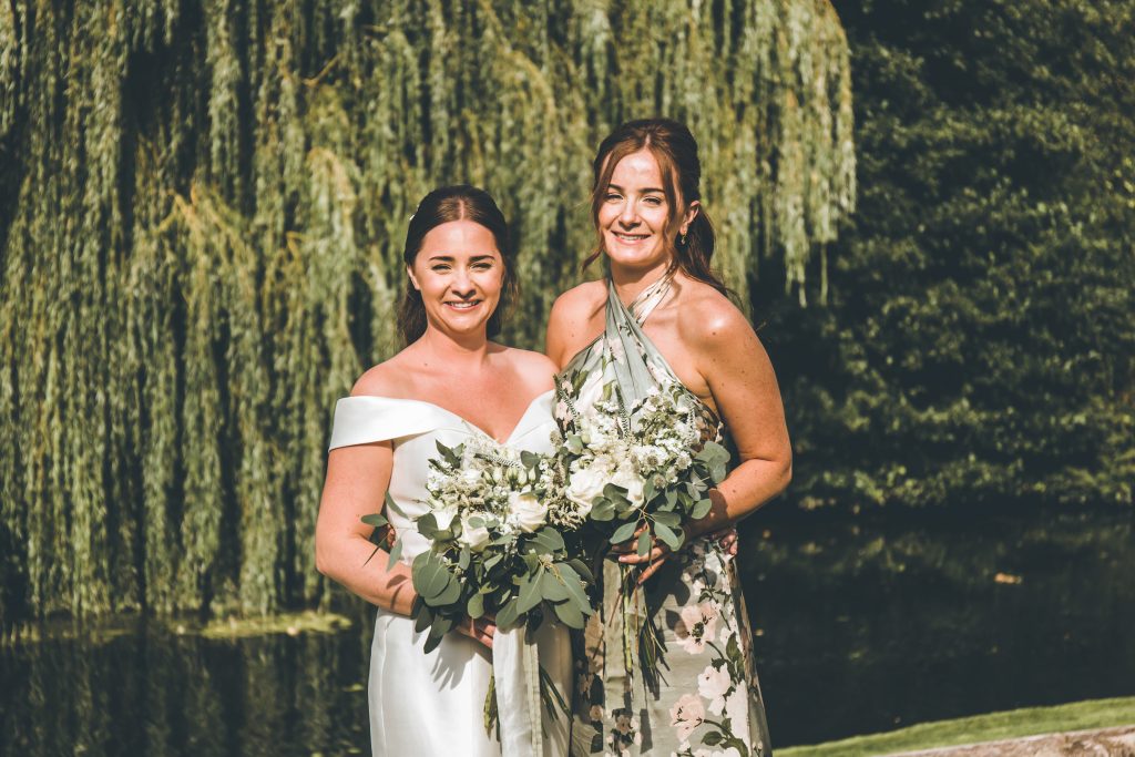 M’s dress was simple and sophisticated, whilst her bridesmaid’s dress had a stunning floral pattern, meaning that the bouquets needed to compliment the dresses without distracting from the style. Bouncy foliage helped create a free flowing structure.